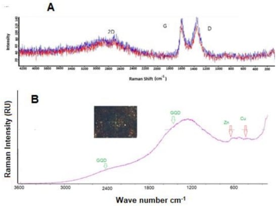 Raman imaging spectroscopy of the electrodeposited samples from the graphene bath was examined by 632 nm laser with a variable power up to 100 mW. The image showed the presence of copper nanoparticles at 580 cm−1 and 428 cm−1 [90]. The broad peaks observed in Figure 5 at 1350 cm−1 and 1450 cm−1 are attributed to carbon in the deposited sample. All the samples examined showed an appreciable Raman intensity in the region of 3000–1400 cm−1. We also examined the Raman imaging using 780 nm laser light; it showed distinct strong peaks at 1380 cm−1, 1545 cm−1, and 2690 cm−1. The peaks are attributed to carbon in the deposited brass. There are a number of papers published in the literature on graphene Raman imaging [91,92,93,94]. The appearance of the above Raman shifts at the above wavenumbers has been attributed to sp2 clusters. The broadening of the D and G bands are attributed to an electron–phonon interaction.