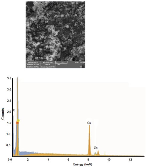 The scanning electron microscope recording of the alloy is presented in Figure 6 for qualitative elemental analysis. It showed distinct peaks of Cu, Zn, and C. The surface morphology showed a uniform distribution of the particles, which are crusty and mid grey in the deposits. The presence of a nodular structure of the micrograins and the absence of a lamellar structure is indicative of the contrasting behavior of the Cu50-Zn200 and Cu100-Zn200 alloys [95]. The particle distribution suggests that the high-carbon low brass would stabilize the dezincification that is observed with high-brass alloys. The EDX spectrum showed the presence of C, Cu, and Zn, which is in agreement with the XRF data discussed earlier. These results suggest that the Cu2+ and Zn2+ ions are being dragged to the electrode by GQD by the electric field where the electron transfer process takes place to deposit the alloy. While conventional brass alloy is shiny metallic, the appearance of the Cu-Zn-GQD alloy is black.