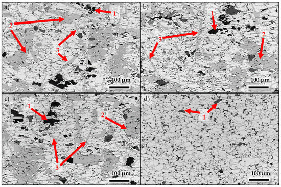 PIT sample micrographs after sintering show a multiphase microstructure. Boundaries between grains can be easily observed on samples at all Ce levels (Figure 1). Dark phases (labeled 1) in the samples are apparent and large (>50μm) in some areas. However, intermediate atomic mass phase (in grey contrast) of irregular shape (labeled 2) are across grain boundaries, whereas needle-like phases (labeled 3) are present in the samples ranging from 8 to 12 Ce wt %, but not in the hypereutectic composition (i.e., 14 wt % Ce). As expected, there is a significant difference between the microstructure of the hypoeutectic and hypereutectic Al-14Ce wt % samples.