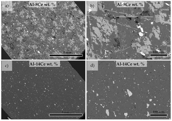 Upon further investigation, we completed an SEM micrograph analysis on hypoeutectic Ce 8 wt % and hypereutectic 14 wt % Ce specimens. Figure 2 provides a side-by-side comparison of the microstructure of Al-8Ce and Al-14Ce wt % by SEM. These images reveal that at 8 wt % Ce, the microstructure developed small bright disordered phases (same phases labeled “1” in Figure 1) and needle-like one are also present. Moreover, at Ce 14 wt % only the small bright phases are visible, and the grain boundaries can be easily distinguished.