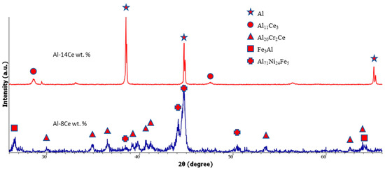 XRD patterns for PIT 14 wt % Ce sample in Figure 3 display diffraction peaks located in almost identical diffraction angles and with similar intensity values of Al FCC (ICSD:187080) and Al11Ce3 [3]. In contrast, sample containing 8 wt % Ce present more peaks with a broader one at 44.8° (2θ). This is consistent with Al FCC and Al71Ni24Fe5 [11]. The pattern in consistent with more disordered phases that are compositionally modulated. Additional peaks are indicative of more phases present in the microstructure, i.e., Al20Cr2Ce (ICSD:236266) and Fe3Al [12].