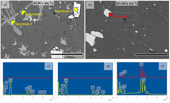 SEM point spectra of (a) Al-8Ce wt % and (b) Al-14 wt % processed via PIT. EDS spectrum (c) spectrum 1 (d) spectrum 2 and (e) spectrum 3 of Al-8Ce wt % (yellow) and Al-14Ce wt % (red).