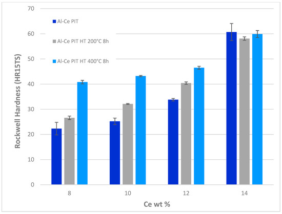 Table 2 shows the Rockwell hardness test (HR15TS) results for the PIT composites before and after HT. Figure 6 shows the results of Rockwell hardness test (HR) for PIT composites before and after HT. Hardness increased in all hypoeutectic samples after both HT conditions. Conversely, at 14 wt % Ce, there is no significant HR difference for the heat-treated composites. This is indicative of a more complete reaction processes between Al and Ce during the elevated temperature PIT process, that rendered a stable microstructure that is unchanged after HT at 200 and 400 °C. Considering that the hypoeutectic Al-8Ce wt % diffractogram revealed less crystallinity after HT, the increment in HR for this samples can be attributed to the formation of new phases and the transformation of the needle-like Fe rich phase after HT. After HT these composites had less porosity, and therefore, higher density. This finding differs from previous literature, which found that the spheroidization of the Fe rich needle-like phase after thermal exposure further negatively affects HV on Al-1.75Fe-1.25Ni wt % alloy [14]. This increment difference in our research may be due to Ce content in our samples (8 wt %) preventing the phase coarsening by diffusion upon HT. It was addressed that the Fe-Ni rich phases have a detrimental effect in the characteristics of the composite. This is proven when, after heat treatment the hardness for the Al-8Ce wt % samples improve significantly, coinciding with the disappearance of the needle-like Fe-Ni rich phases. It will be hard to address, before and after the heat treatment, the impact of the Fe-Ni-Cr, because we don’t have Al-8Ce wt % processed by the same PIT method that does not contain Fe, Ni and Cr, thus we cannot make a comparison in hardness.