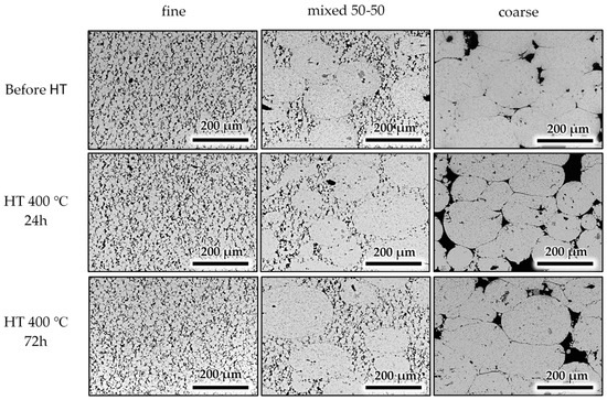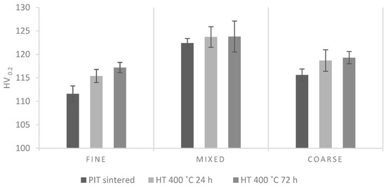 There is a correlation between HT, holding time and HV results (Figure 10). All powder size samples showed higher HV values after heat treatment for 24 h. This increment was even larger after HT for 72 h. for the fine powder samples. The larger difference in HV increment on the fine and coarse powder samples is due to the preservation of phases in the microstructure and better densification that occurred after HT. Mixed 50-50 samples revealed the best densification of all powder conditions before heat treatment. As a result, the microstructure characteristics were retained, and densification did not change appreciably after HT. Thus, the difference in HV before and after heat treatment is not significant for these mixed 50-50 powder samples.