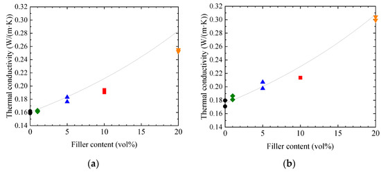 As is clear from Figure 2, the thermal conductivity increases with the increase in the content of fillers, showing a positive correlation with one another. Although in the literature the value of the thermal conductivity of silica ranges from 1.4 to 20 W m−1 K−1 [26,27,28], it is much higher than the value of the epoxy resin sample 1 shown on the ordinate of Figure 2a or Figure 2b. Regarding this, the above result is quite understandable. Furthermore, as shown by the curves in Figure 2, the thermal conductivity of the NC samples can be well approximated by the following Bruggeman equation [29,30] based on the effective medium approximation theory: