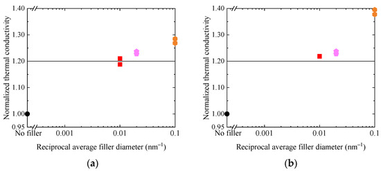 As mentioned above, we have been carrying out this research as part of a project, and one of the goals of the project is to improve thermal conductivity 1.2-fold by replacing the epoxy resin with its NC. The horizontal lines drawn in Figure 3 are meant to guide the eyes. As shown in Figure 3, when we added the silica filler by 10 vol%, we can achieve the target if the filler diameter is 10 or 50 nm at 25 and 100 °C. However, the filler diameter of 100 nm has almost no margin. Taking Figure 2 into account, for the silica with the diameter of 100 nm the filler content of 5 vol% or less cannot exceed the target value. From Figure 2 and Figure 3, the boundary for silica seems to be a diameter of 100 nm and a filler content of 10 vol%.