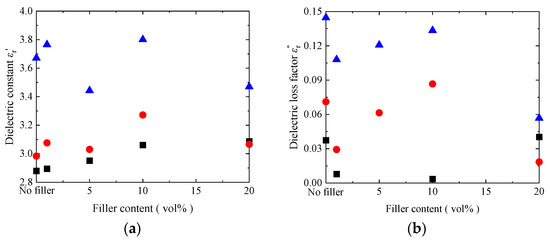 εr′ (a) and εr″ (b) as a function of filler content, measured in epoxy NC samples with 100-nm silica at 20 (■), 100 (●), and 140 (▲) °C.