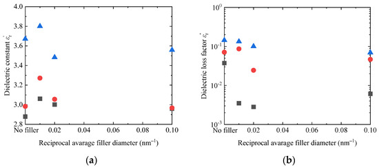 εr’ (a) and εr” (b) as a function of reciprocal filler diameter, measured in the epoxy resin sample and the NC samples with the filler content of 10 vol% at 20 (■), 100 (●), and 140 (▲) °C. Several data overlap each other.