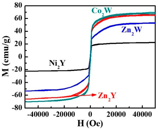 - Albanese, G.; Carbucicchio, M.; Asti, G. Spin-order and magnetic properties of BaZn2Fe16O27(Zn2-W) hexagonal ferrite. Appl. Phys. 1976, 11, 81–88. [Google Scholar] [CrossRef]