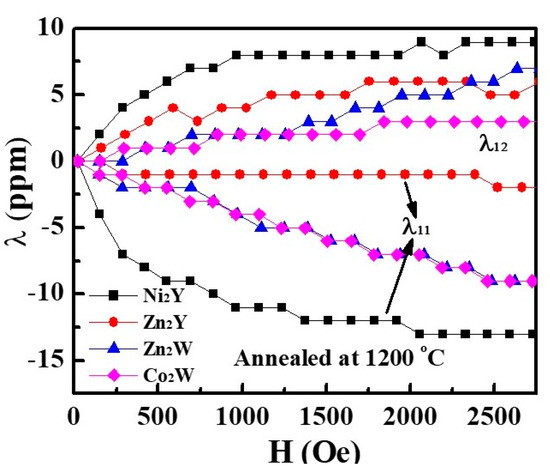 - Licci, F.; Rinaldi, S. Magnetostriction of some hexagonal ferrites. J. Appl. Phys. 1981, 52, 2442–2443. [Google Scholar] [CrossRef]
