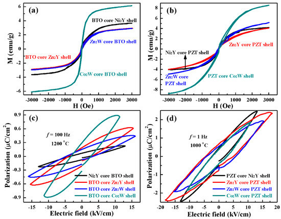 - Liu, Y.; Zhang, J.; Zhou, P.; Dong, C.; Liang, X.; Zhang, W.; Zhang, T.; Sun, N.X.; Filippov, D.; Srinivasan, G. Magneto-electric interactions in composites of self-biased Y-and W-type hexagonal ferrites and lead zirconate titanate: Experiment and theory. J. Appl. Phys. 2019, 126, 114102. [Google Scholar] [CrossRef]