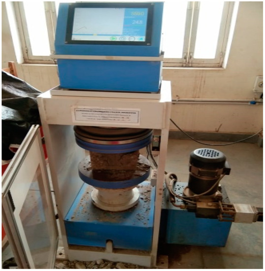 First, 12M, 14M, and 16M of NaOH solution were prepared one day before use by dissolving solid caustic soda in water. The prepared sodium oxide solution was then mixed with sodium silicate solution to prepare an alkaline activator. The alkaline activator ratio was kept at 2.5. To obtain a uniform mix, all the dry ingredients, such as fly ash, calcined clay, stone dust, and aggregate, were mixed for 3 min, as mentioned in Table 5, before adding an alkaline activator. Later, the alkaline activator and superplasticizer and required amount of water were added to the dry mixture and rotated in the concrete mixture for two minutes. After preparing the geopolymer concrete mixture, it was poured into a 100 mm cube mold to test the compressive strength and tensile strength. All concrete-filled specimens were kept for drying at room temperature for a day. Then the samples were removed from the mold and kept for curing at different temperatures. The geopolymer concrete was prepared with a 5–15% variation of fly ash with calcined clay. The prepared samples were then cured at ambient temperature, 80 °C, and 100 °C for 24 and 48 h. Thus, heat-cured samples were removed from the oven after 24 and 48 h and kept at room temperature. Then 28-day compressive strength and the 28-day tensile strength were found. The slump of above-prepared concrete was also found.