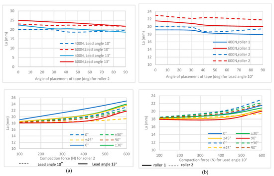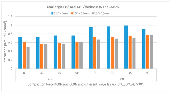 | Angle of lay up | Compaction force | Contact line La (mm) | Pressure | Contact line La (mm) | Pressure | Contact line La (mm) | Pressure | ||||