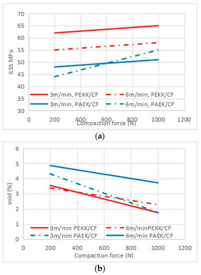 - The minimum lay-up speed and the maximum compact force for both materials have the best results (low porosity less than 2%).