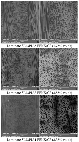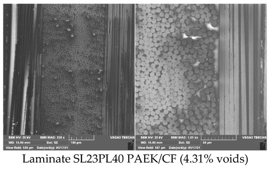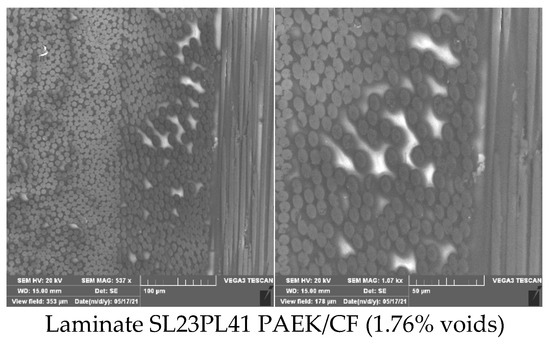 - The selected parameters for the samples with PEEK resin have better mechanical characteristics than the PAEK samples. The reason for that may be the greater flow of the PAEK resin, which can be seen from the SEM images.