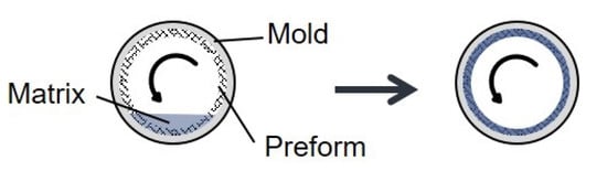 In addition to shell-shaped FRP components, rotationally symmetrical components such as drive shafts, tubes, rollers or tie rods are of particular importance. These components are often produced using pultrusion, winding, resin transfer molding (RTM) or blow molding [3]. An alternative to these established manufacturing processes is the rotational molding process. In the early days of this process, cutted glass fibers with matrix were often used for liquid containers and silos [4,5]. Meanwhile, structural components are also manufactured for which a dry perform with continuous fiber reinforcement is used [6,7,8,9]. This preform made of semi-finished products is placed in a mold and impregnated with a matrix under rotation (see Figure 1). The matrix used can be either thermoplastic [6] or thermoset [7,9]. The impregnation pressure is generated by the resulting centrifugal force due to the rotation. Infiltration and curing take place during rotation. After sufficient curing, the component can be removed from the mold with no need of further finishing work.