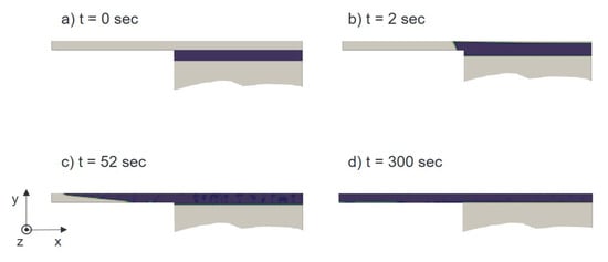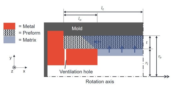 Different stages of the impregnation are illustrated in Figure 13. At t = 0 s, the matrix is introduced into a region without permeability and there is no rotation yet. It can be observed that the radial impregnation (y direction) of the preform takes place very quickly at the parameters used and is almost complete at t = 2 s. Axial impregnation requires considerably more time and is preceded by a flow front on the inside of the mold (Figure 13c).