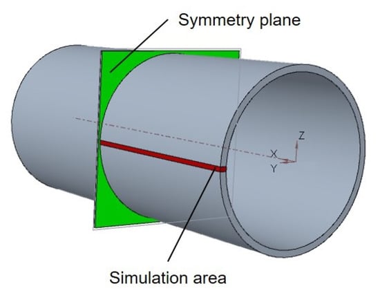 In order to reduce the number of mesh elements and to achieve an acceptable calculation time, the rotational symmetry around the rotation axis is used as shown in Figure 3. In addition, a symmetry plane is introduced in the center of the considered area. This simplification allows the calculation to be reduced to a two-dimensional simulation case. The calculation time can thus be significantly shortened. The simulation area is marked in red in Figure 3.
