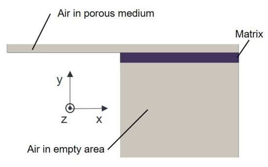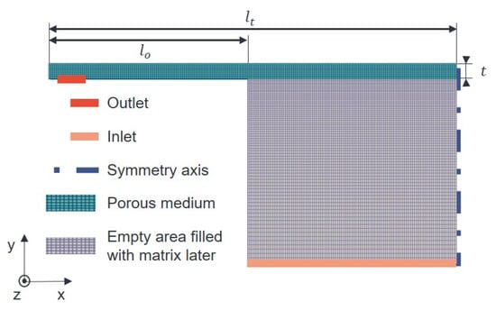For the correct functioning of the model, initial conditions and boundary conditions at the edges of the considered area have to be defined. In this context, the already mentioned symmetry axis (Figure 3 and Figure 4) needs to be addressed. Further inital and boundary conditions are listed in Table 1. At the outlet, the boundary condition prevents matrix or air from flowing back into the porous media through the outlet. It acts like a membrane which is only permeable in one direction [27]. In addition, one boundary condition is selected at the inlet where air can permanently flow into the simulation area. Fixed values are specified for pressure and temperature. At the walls, a slip boundary condition is set. This condition adds no additional drag and only the Darcy term influences the flow. For flows through porous media with low permeability, the drag of a no-slip wall is negligible compared to the porous drag.