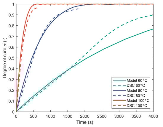 For the isothermal runs, measurements are conducted at 60 °C, 80 °C, 100 °C. The samples are quickly mixed and placed in the DSC analyzer, which has already been preheated to the appropriate temperature. After no more heat is released, the samples are rapidly cooled and then heated to 300 °C at a defined heating rate of 10 °C min−1 in order to calculate the residual heat of reaction. With this residual heat and , the curves are determined and fitted with the nonlinear least-squares algorithm, as shown in Figure 6. The required prediction of the fitted Kamal-Sourour model agrees well with the isothermal DSC data, only the slope towards the end of the curves is not accurately reproduced because the DSC measurements do not reach a final value of = 1.
