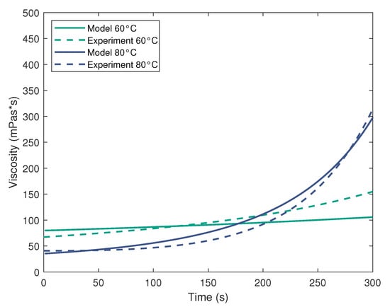where is the degree of cure, the degree of cure at gelation, T the temperature , R the gas constant and the fitting parameters. The viscosity measurements are provided by the datasheet of the manufacturer [38]. The focus of the fitting lies upon the time period crucial for the rotational molding process with values below 300 s. Figure 7 shows a comparison between the values predicted with the Castro-Macosko model and the experimentally measured values of the datasheet. The corresponding parameter values are presented in Table 4.