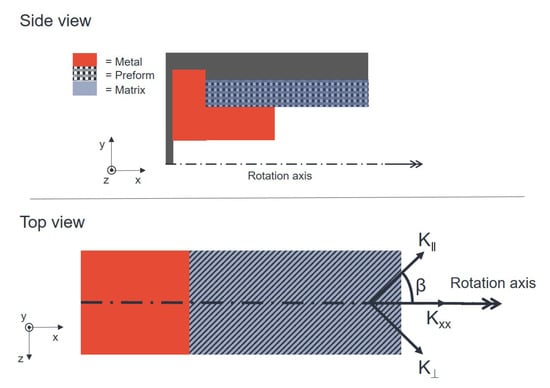 In the rotational molding process, depending on the fiber orientation, it often occurs that a mixed state between longitudinal and transverse permeability in axial direction (x axis) exists Figure 9. Axial permeability is the permeability along the axis of rotation. Therefore, an extended model is applied [10,40], which considers longitudinal and transverse permeability according to their proportions: