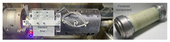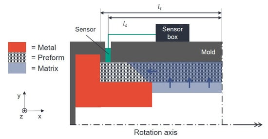 In order to obtain a high impregnation pressure at moderate rotational speeds, a large mold with an outer diameter of the component of 80 mm is selected (see Figure 10). Due to the high total mass of the rotational mold, the additional mass due to the sensor technology is less significant. Nevertheless, an axisymmetric balance weight must be fixed to ensure sufficiently high rotation speeds and to avoid vibrations.