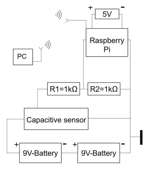 Since a cable-guided power supply is not possible, the electrical supply of the capacitive sensor is ensured by a series connection of 9 V rechargeable batteries (see Figure 11). The sensor is embedded into the mold and connected to a Raspberry 4 8 GB single-board computer. Raspberry then transmits the signal wirelessly via WiFi to a measurement computer for further steps. Except for the sensor, all electronics are housed in a box that is attached to the mold (see Figure 10 and Figure 12). The distance of the sensor from the center of the mold is 67.5 mm.