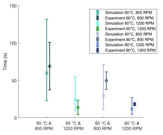 It can be seen that the discrepancy between mean values of experiments and simulation is small, varying between twenty and six seconds depending on the configuration. The deviations are between −41.7%–65.8%. Overall, this results in an average deviation of 43.8%. In the simulation, shorter impregnation times are calculated, except for configuration 2. The higher temperature and speed, the lower the scatter of the measurements.