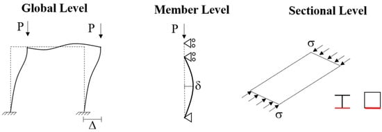 In recent decades, the use of aluminium alloys has spread into many engineering fields. In fact, this material is successfully applied in transportation, such as in the rail industry (subway coaches, sleeping cars), automotive industry (car and moto components, moving cranes), and shipping industry (motorboats, sailboats). Aluminium alloys are also successfully used in the civil engineering field where they are employed both as a main element and as a secondary element within civil structures [1,2]. The main advantages of aluminium alloys are related to their lightness, corrosion resistance, and high functionality of structural shapes due to the extrusion process. For these reasons, aluminium material is competitive with steel in the application of structural design. However, used as structural material, it is affected by the same problems concerning the steel members, particularly the instability phenomena which can occur at different levels (Figure 1) and either in the elastic or plastic range. These phenomena are even more relevant in the case of aluminium structures, considering that the Young modulus of aluminium is about one third of that of the steel. In this paper, the attention is focused on studying the effect of local buckling effects on the ultimate response of aluminium members subjected to uniform compression or non-uniform flexural bending. Clearly, local and distortional buckling occurs when the portions of a single aluminium member are subjected to uniform or non-uniform compression. For this reason, the real prediction of the ultimate response of aluminium members becomes very complex and, generally, the proposed methodologies by the current codes underestimate their maximum capacity during compression or bending. Recently, Krishanun Roy et al. [3,4] highlighted that, in the case of channel section members, the design codes (Aluminium Design Manual [5] Australian/New Zealand Standards [6], Eurocode 9 [7] and Eurocode 3 [8]) are conservative within the 20–30% range, with respect to the experimental tests. The same problem was encountered by Feng et al. [9,10] in the case of the circular hollow sections of the aluminium alloy with holes during compression or bending. In the case of compression, the authors provided a new design equation based on the current design formulae that use the effective area method (EAM).