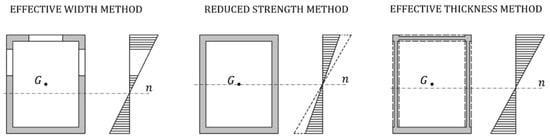 The first approach is very well known, being codified for many years with particular reference to steel structures [8]. It was first introduced by Von Kármán in 1932 [23]. He stated that, for a fixed thickness, a fictitious plate with the width of would have the critical stress equal to the yield stress. If the actual plate has a larger width, the capacity is the same as that of the fictitious plate. In a plate, the real stress distribution is approximated, or replaced, with two strips which describe the load-carrying, effective width of the plate. Consequently, this method is based on reducing the cross-section area in the parts affected by plate buckling.