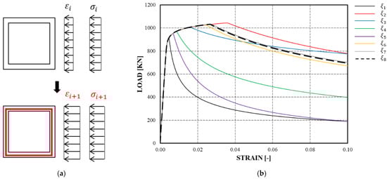 The generic steps of the procedure are shown in Figure 4a. At the initial step, a generic box section is subjected to the strain level and, consequently, to the stress level . At step , the strain level increases, and it is equal to , where the corresponding stress state is . By applying Equations (14) and (15), the effective thickness of the box section decreases (red line) with the definition of the reduction coefficient .
