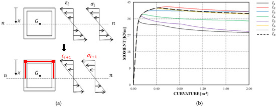 The generic steps of the procedure are shown in Figure 5a, while in Figure 5b, the results of the numerical procedure are depicted in terms of the moment–curvature curves. The considerations, made in the case of uniform compression, are still valid for the box-shaped beam under a non-uniform bending moment.