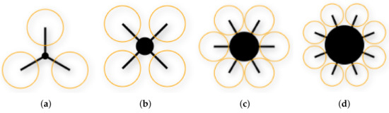 The body consists of a primary and central element with circular symmetry. The architecture provides that all the avionics, such as the Flight Control Unit (FCU), GPS antenna, electronics, and battery are housed inside to make this possible. From its assembly derives an external track, which runs in a circumferential direction on its outer perimeter. The UAV arms are grafted onto this track in a variable number between 3 and 8: it is up to the end-user to select their number. Each one can be equipped with a single motor (S) on the upper side; a second rotor can also be added to the lower side, thus switching to a double (D) configuration. Furthermore, it is possible to add an inflatable component for each arm to ensure a water landing or shock absorption in challenging scenarios involving the risk of hard landings, which turns the configuration into an amphibious (A) one. This work narrows the analysis to the defined set of designs listed below:
