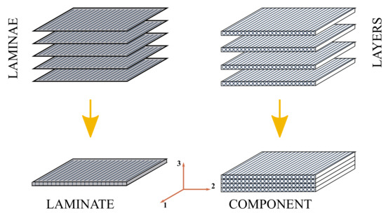 Comparison between unidirectional laminae, stacked into a laminate, and FFF layers, piled into a component with a linear infill.