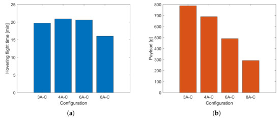 Since the diameter of the propeller is already optimized by the choice of the maximum value compatible with each configuration, the choice relied on the models available on the market that maximized and minimized . The datasheet of the identified items is proposed in Table 1. The pitch values relates to manufacturer suggestion; stall with increasing load is avoided as the pitch to diameter ratio is less than .