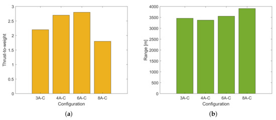 With these ranges evaluated, the engine database research can be refined with a view to the optimal model. The UAV understudy features four different setups. Not all the input parameters keep constant across them, translating into other preliminary evaluations and different ideal ranges. The all-up weight can be kept constant, assuming that the drone is fully loaded; the frame size and the battery also, as they are kept in the transition between one configuration and another. The propeller diameter and, in particular, the number of rotors change explicitly. Table 2 keeps together the input and the output parameters, allowing some considerations on the ranges overlap.