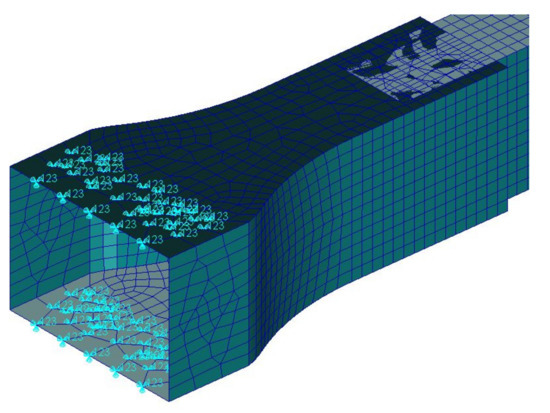 Once the mesh has been defined, the upper and lower arm elements have been welded, using the equivalence tool to bond the superposed nodes of different surfaces and delete duplicates.