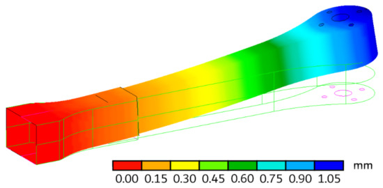 Transverse displacement map (X direction), superimposed on the arm deformed shape. The results are expressed in mm.