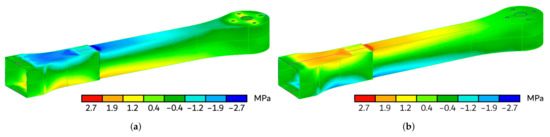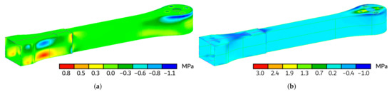 Axial component (Y direction) of the stress tensor map, superimposed on the arm deformed shape. The results are expressed in MPa. (a) Top view. (b) Bottom view.