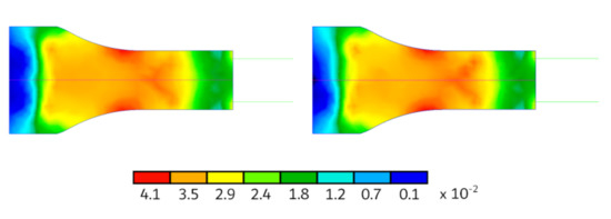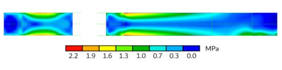 The limit values of are MPa and MPa, as shown in Figure 16. They take place in a symmetrical position over the top and the bottom surfaces of the whole assembly; they are also symmetric in the lateral surfaces with respect to a horizontal mid-plane. coincides with in the material reference system in almost all the regions of the assembly because all the filaments point toward the axial direction; this excludes the curved lateral surfaces. The limit values of are MPa and MPa, as shown in Figure 17a. It is defined in the lateral surfaces only because it points along with the thickness direction of the shell elements elsewhere (thus it equals 0). Where it is defined, it coincides with in the material reference system. The limit values of are MPa and MPa, as shown in Figure 17b; the highest values manifest in the motor anchoring region. In the upper and lower surfaces of the assembly, coincides with due to the filament deposition direction. It is not defined in the lateral surfaces (thus it equals 0) as it points towards the thickness direction of the shell elements.