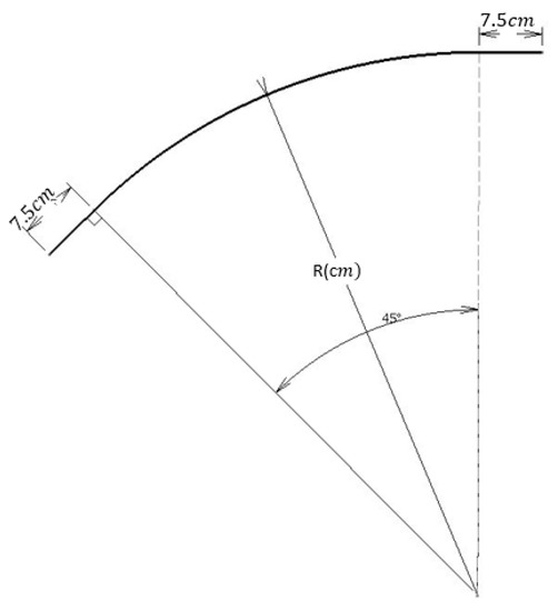 Then, the thermoset prepregs were left to rest for 30 min at room temperature. After that, the tows were stored on the lay-up head and directly delivered from the spools to the roller to be steered on the rigid aluminum tool. The aluminum tool was cleaned with acetone before each experiment to reduce the shear force created by friction between the tool and prepreg. Finally, prepreg tows were deposited on an aluminum tool with different steering radii of 55, 60, 65, 67, 70, and 75 cm, according to Figure 2. The process of steering the tape was proceeded for this experiment by adjusting the AFP software according to Table 1.