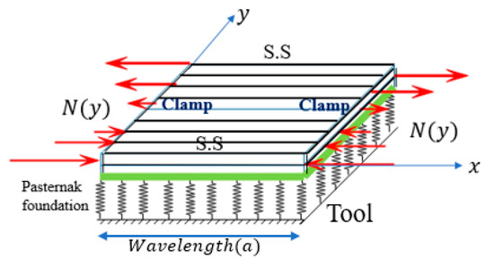 Out-of-plane wrinkle formation of steered tows during the automated fiber placement process can be modeled as a buckling problem of a rectangular plate resting on a Pasternak elastic foundation, which is under non-uniform load. The load is applied by a roller to two clamped edges, and the other two edges are considered as a simply support (S.S) condition in accordance with the geometry of the problem. Figure 4 shows the theoretical model of wrinkle formation during steering.