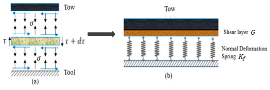 In this paper, a Pasternak foundation representation is adopted to model the mechanical properties of the tool and prepreg tack [21,22]. Figure 5 shows the free body diagram of adhesive joint and elastic modeling based on the Pasternak model. This model replaces the elastic foundation as a combination of the shear layer and normal linear spring. As a result, the pressure of the elastic foundation surface can be mathematically written as: