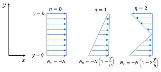 where is the width of the tow, and is a constant between 0 and 2, for example, and correspond to uniform compressive load and pure bending load, respectively. Figure 6 demonstrates the in-plane load distribution for various values of .