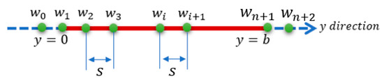 To solve the nonlinear homogenous ordinary Equation (16), The finite difference method (FDM) was employed [27]. In this method, first, the interval between and is partitioned into subintervals. Then, the differential operators are approximated by the differential quotients. Based on the FD method, differential operators can be expressed in the following forms: