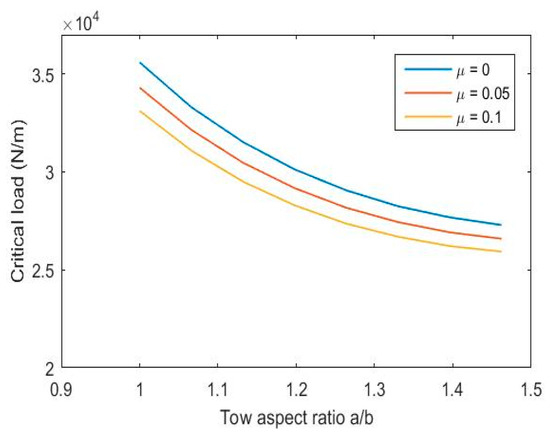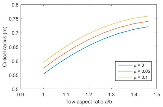 In contrast, according to Equation (30), the steering radius has an inverse relation with the buckling load. As a result, an increasing in-plane load leads to a decrease in radius steering. Besides, a rise in the value of the initial defect of the tow based on the Koiter model leads to a slight growth in critical steering radius and a slight reduction in buckling load. In Figure 11 and Figure 12, the value of the aspect ratio for the tow is assumed to be 1.5.