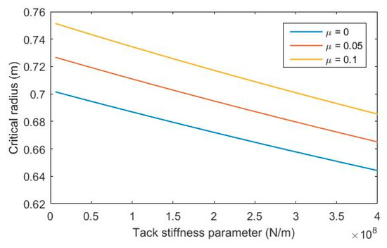 Critical radius steering variations with respect to tack stiffness parameter for different initial defect coefficients.