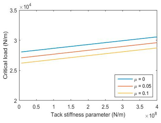 Critical buckling load variations with respect to tack stiffness parameter for different initial defect coefficients.