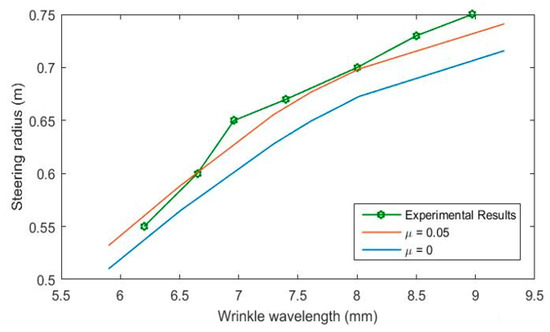 To validate the theoretical model with experiment results, in this section, a comparison is made between the values of the wrinkle wavelengths calculated from the theoretical wrinkle model and the experimental findings. For this reason, the value of maximum load from Equation (30) as a function of critical radius is replaced into Equation (25) instead of . By solving the determinant of Equation (25) for wrinkle wavelength (, the value of wavelength is found for each critical radius. Figure 13 shows steering radius versus wrinkle wavelength for both experimental and theoretical results. The values of spring constants assume to be k = 3.25 × 108 (N/m) and G = 605 N/m according to [4,9] in the mathematical wrinkle model.